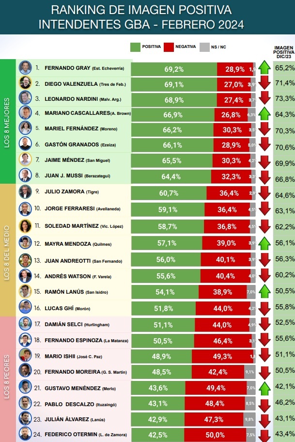 Aunque la imagen positiva de Julio César cayó 4% con respecto a diciembre de 2023, según este estudio, a la mayoría de los intendentes les ocurrió lo mismo. Solamente cinco de los veinticuatro aumentaron su buena imagen: Fernando Grey (Estaban Echeverría); Mariano Cascallares (Almirante Brown); Mayra Mendoza (Quilmes); Lucas Ghí (Morón); y Gustavo Menéndez (Merlo).