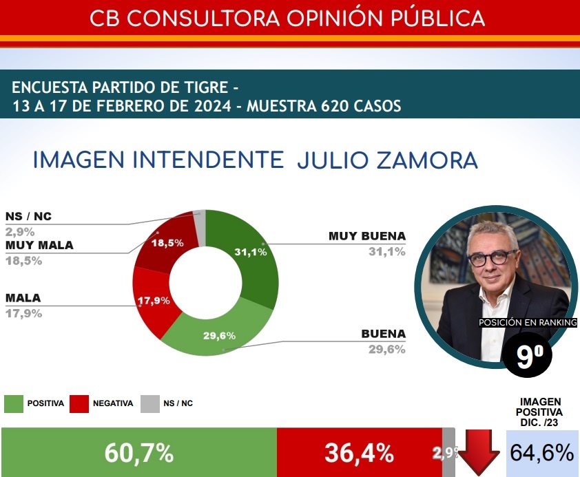 Un estudio de CB Consultora Opinión Pública arrojó como resultado que el intendente de Tigre posee una imagen positiva del 60,7% contra una negativa del 34,6%. Julio César Zamora se encuentra noveno en el ranking de intendentes del conurbano que está liderado por Fernando Grey de Esteban Echeverría con un 69,2%.