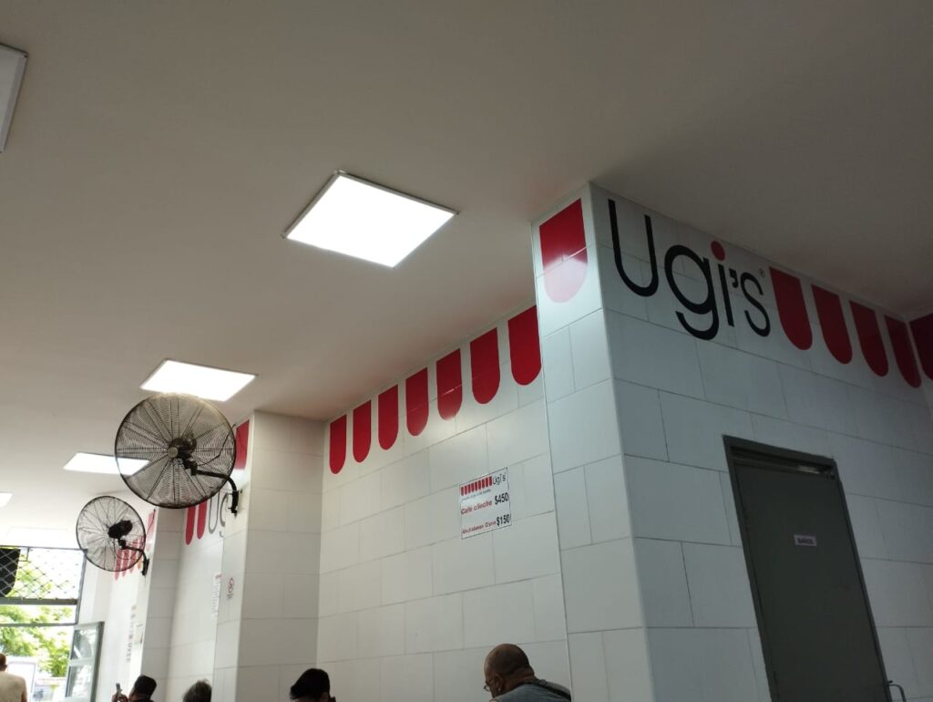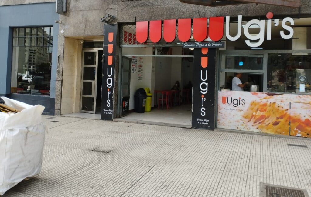 Nadie planifica como salida ir a comer a un Ugi’s de microcentro. Simplemente es una opción gastronómica para salir del apuro de saciar el hambre. Esto queda bien claro un día de semana al mediodía. En las mesas de esta pizzería están el recuperador urbano que empuja el carro, un mensajero con el casco de su moto a un costado y gente que circunstancialmente andaba por ahí. Las heladeras del local están casi vacías y la única bebida que tienen para vender eran gaseosas lima limón. ¿La empresa tendrá problemas con los proveedores?