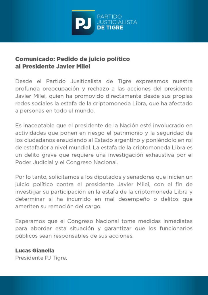 Luego de las publicaciones del presidente en Twitter, actual X, sobre el negocio de la criptomoneda Libra, el Partido Justicialista de Tigre lanzó un comunicado que le pide a los senadores y diputados que intervengan para que se lleve adelante un juicio político con la investigación correspondiente. El comunicado que lleva la firma del presidente del partido a nivel local, Lucas Gianella, considera: «La estafa de la criptomoneda Libra es un delito grave que requiere una investigación exhaustiva por el Poder Judicial y el Congreso Nacional». De acuerdo a los datos difundidos, 74.698 personas invirtieron en Libra, tanto en Argentina como a nivel internacional, y perdieron 286 millones de dólares.